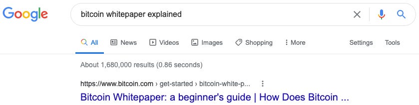 1.7 million results for [bitcoin whitepaper explained] means there aren’t a ton of hidden gems. Worry not, we’ll make up for it with humor, metaphors and nerdy stats.