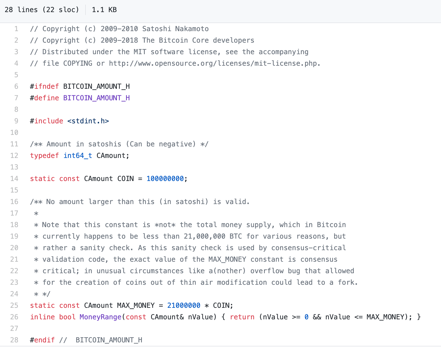 Also, each Bitcoin can be subdivided into 100,000,000 “Satoshis” aka “Sats”, similar to 100 pennies = 1 US Dollar. Interestingly, Satoshi’s source code references these Sats as the base unit, instead of entire coins (line 14 below). He presumed people way off in the future wouldn’t be tossing around entire coins all that often.
