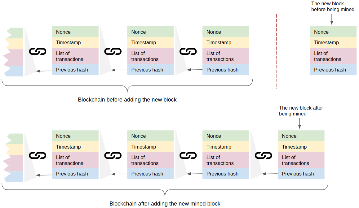 If anything is changed in any block, the hash (i.e. digital fingerprint) changes and all subsequent blocks in the chain are broken. Proof of work means each link between blocks is hard to generate, so you need to “prove you’ve done the work” to create it.